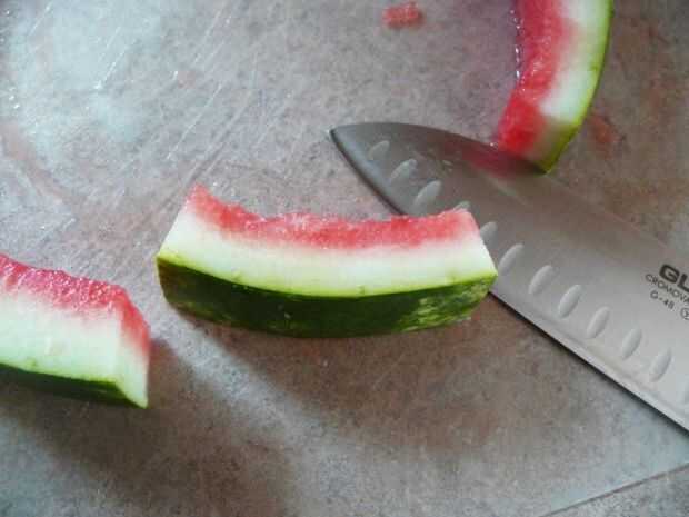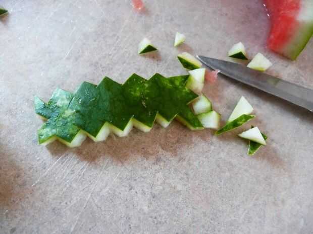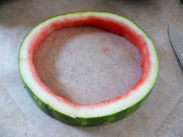 Una cáscara media sandía hace una perfecta visualización. Cuchara de cualquier fruta roja residual desde el interior. Coloque la corteza (parte cortada hacia abajo para drenar) sobre un plato. Cubra con envoltura de plástico subsistencia que refrigerada (no congelada) hasta 3 días.