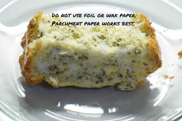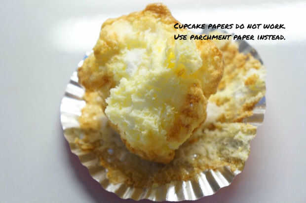 Dependiendo de qué forma desea, determinará los recipientes utilizados para esta receta. Yo intente una sartén antiadherente la próxima vez y a ver que pasa con papel de pergamino. Usé una bandeja para hornear forrada con papel pergamino, molde forrado con papel de aluminio (el bateador pegado terriblemente) y un bollitos forrados con una lámina y un forro de papel, (pegado terriblemente). Encontrar algo para evitar el pegarse, fue un problema. A mi me funciono mejor el papel de pergamino. (No usar mantequilla porque el aceite no es bueno para las claras de huevo a batir y no quería que los picos a colapsar si la masa se puso en contacto con una superficie aceitosa). Papel de cera se adhieren también.