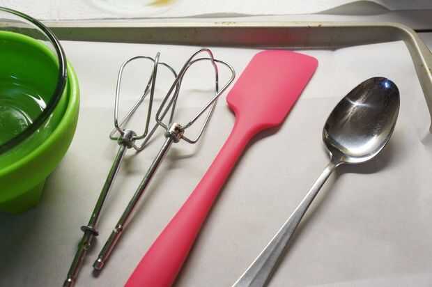 Vidrio mezcla tazones (no de plástico; aceite es difícil de quitar del plástico y aceite puede evitar picos cubiertos, espátula, batidora de mano, tablero de corte, mezcla y cucharas de medición.