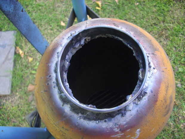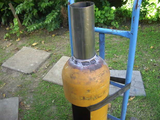 Hicieron dos anillos de hierro barra 1"/ 8, uno para la salida, 3" / 4 de ancho y uno para la entrada, 1 "/ 2 amplia. Soldar tratando de mantenerse bien colocado en el cuerpo del cilindro.