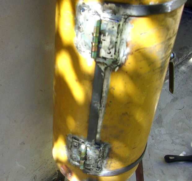 yo pensaba improvisar bisagras, pero en última instancia favorece el tiempo sobre el costo y compradas dos bastante robustas bisagras, que estén soldada en su lugar.