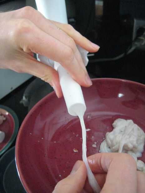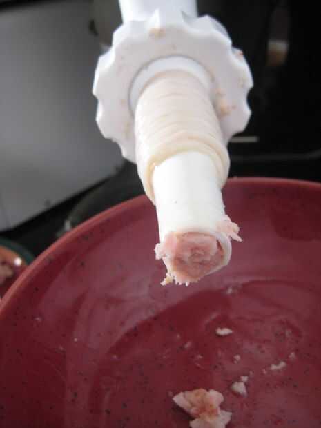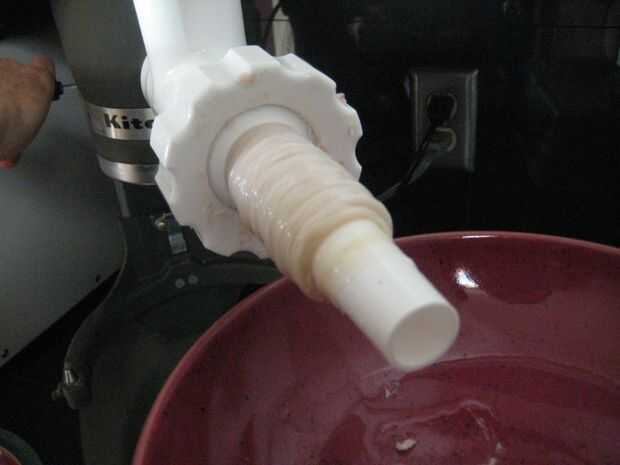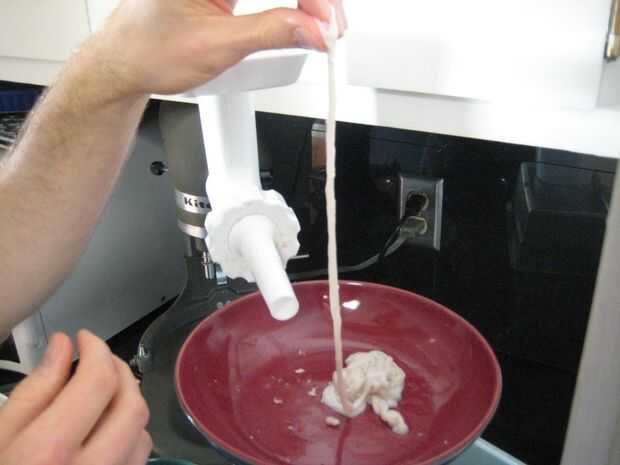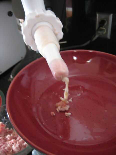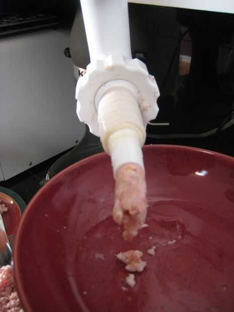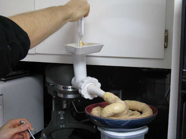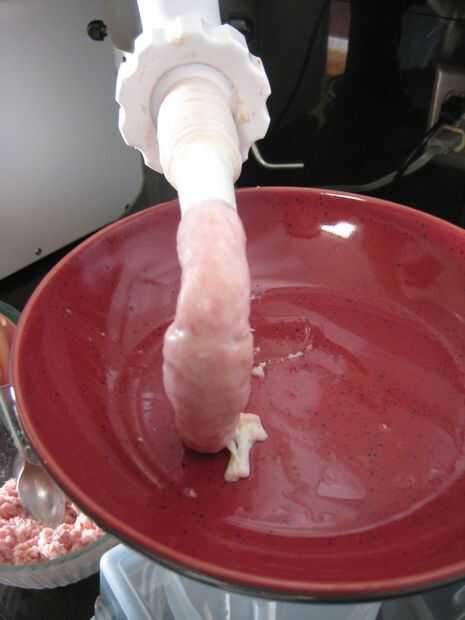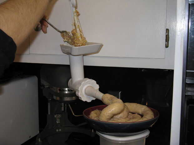 Con el todos los ingredientes mezclados, es hora de empezar a hacer embutidos. Quitar las tripas de su baño, cargarlos en el estirador en el aditamento de molino de carne para la batidora Kitchen Aid y enciende la cosa!