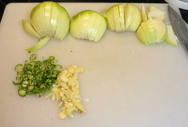Añadir las cebollas y los chiles en una olla de aceite caliente y revolver hasta que las cebollas comiencen a ablandar. Reservamos los ajos agregar más adelante así que más de su sabor vendrá a través del final. (Como alternativa, agregue el ajo ahora si quieres que sea muy sutil).