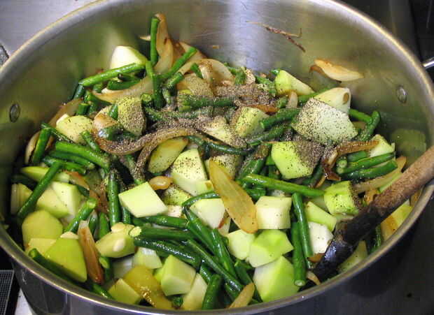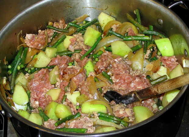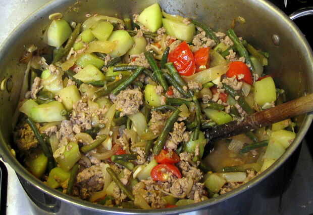 Cuando la olla ha vuelto a temperatura agregar la salchicha de pavo. Romper en trozos pequeños y revuelva periódicamente para cocinar a través de. Cuando la carne esté cocinada, añadir un puñado de tomates frescos picados. Te caen poco más de jugo, que debe mezclarse muy bien con el jugo de chayote.