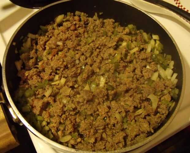 marrón su salchicha, pimientos y cebollas en una sartén hasta que la carne ha perdido su color rosado, de drenaje y deje que se enfríe un poco.