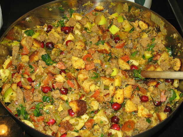 * Tuve casera stock sobrante de un pavo anterior, por lo que fue una elección obvia. Es fácil si tienes una olla a presión y una idea aún más inteligente si tienes espacio en el congelador decente su propio stock. Si estás haciendo el aderezo vegetariano, utilizar caldo de verduras casero o disuelve los cubitos de caldo de verduras.