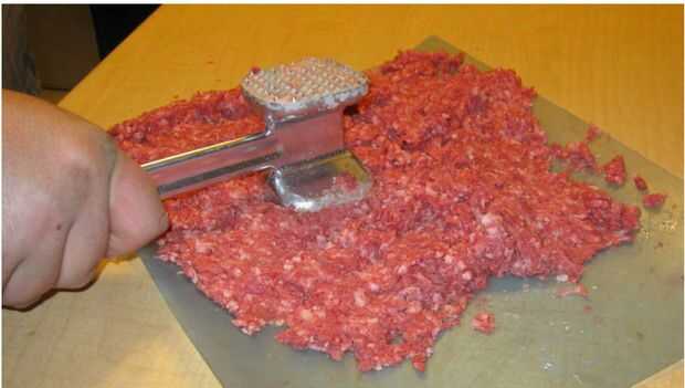 Aunque la receta original pedía golpes, esto parecía muy intensivo de mano de obra. Para acelerar el proceso, me encontré con la carne a través de un molino y luego golpeado para conseguir la textura deseada.
