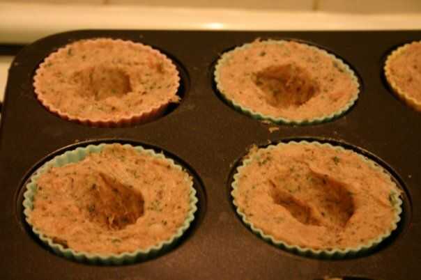 Presione la carne en casos de Magdalena de silicona (digno de aproximadamente uno salchicha por caso) y use su pulgar para empujar un agujero en la parte superior de cada uno.