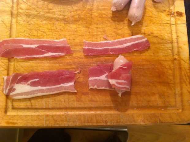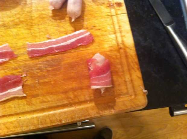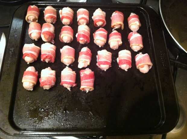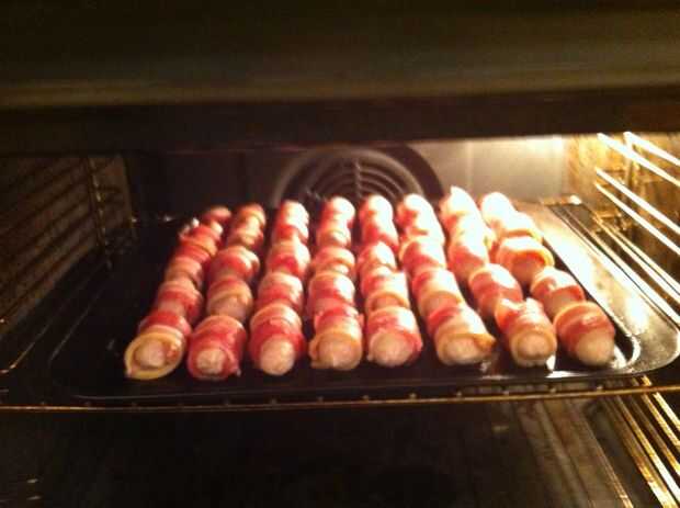 Salchichas envueltas de tocino (cerdos en mantas) (2 / 3 paso)