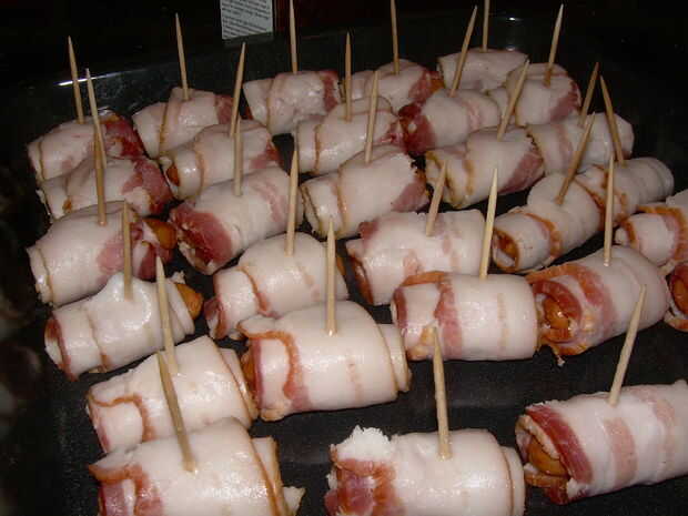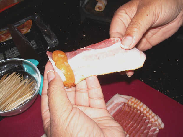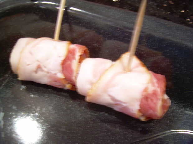 entonces cuando el pequeñajo está todo apretado en el tocino, pinchar con un palillo de dientes para asegurarlo en su lugar. Una vez más, asegúrese de que el tocino esté frío... como se sienta, se convierte en más difícil de trabajar, lo que resulta en salchichas poco descuidados.