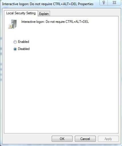 Haga doble clic y activarla. Aplicar y pulse Aceptar. También recomiendo desactivar la política justo debajo de él "Inicio de sesión interactivo: no requerir CTRL + ALT + DEL". Pedirá que presione control + modificar eliminar antes de acceso en.