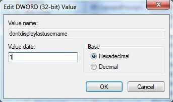 Busque y abra el vaule "dontdisplaylastusername". Cambie el valor a 1 y haga clic en Aceptar.