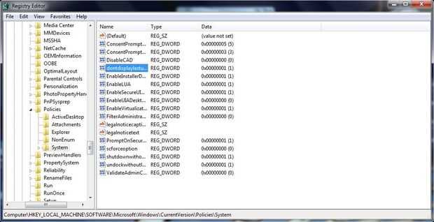 Ahora, vaya al directorio HKEY_LOCAL_MACHINE\SOFTWARE\Microsoft\Windows\CurrentVersion\Policies\System
