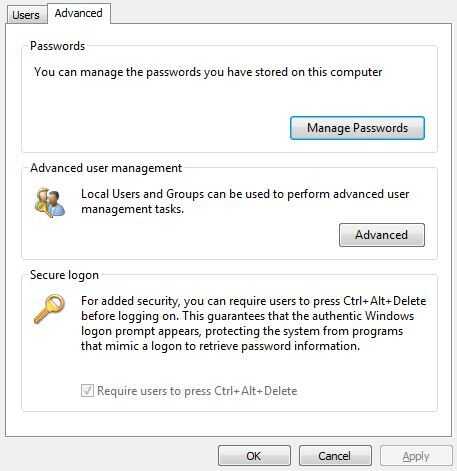 Escriba control userpasswords2. Esto abrirá las cuentas de usuario. Asegúrese de que "los usuarios deben introducir un nombre de usuario y una contraseña para utilizar este equipo" está marcada. Entrar en la ficha avanzadas. En Inicio de sesión seguro, marque la casilla dice "requieren usuario presione Ctrl + Alt + Supr". Aplicar y aceptar estos valores.