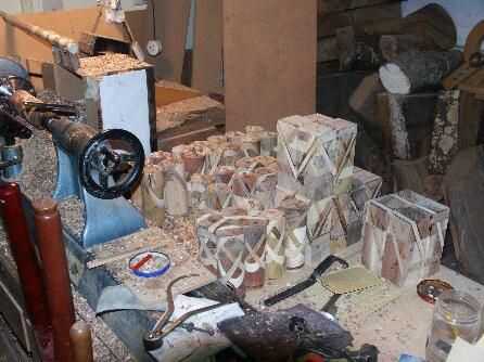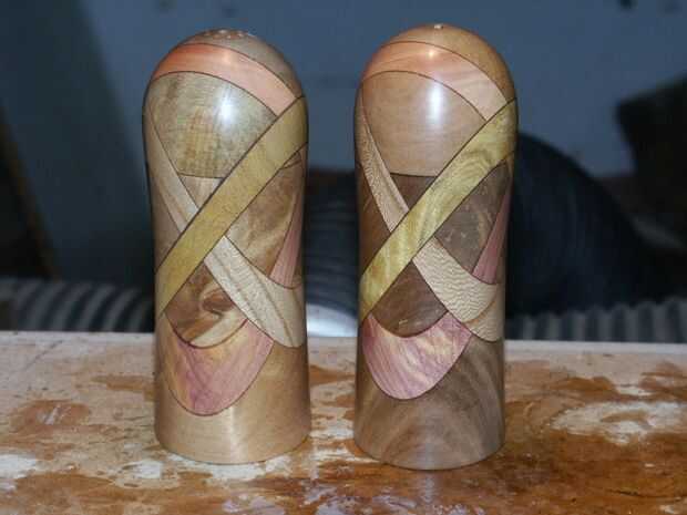 laminado varios tipos de exóticas o madera de Nueva Zelandia para formar una pieza esculpida, en este caso un conjunto de saleros y pimenteros. El proceso es bastante complicado pero fácil de seguir, los criterios de mayor precisión en el corte de la madera a los tamaños correctos. Estos son los pasos para un conjunto de saleros y pimenteros. Primero empiezas de cortando a 2 cuadras de madera [cuerpo] 100 x 50 mm x 50 permite mm decir esto es nogal y 2 bloques de madera deja decir Mora [amarillo] [Top] 50 x 50 x 40 mm. El 50 mm x 50 mm x 40 mm bloque se pega a la parte superior del bloque principal, esto luego es lijado en los 4 lados para quitar cualquier exceso de pegamento. El siguiente paso es dibujar dos líneas en una de las superficies planas con un empate de plantilla [pieza de madera de 8mm de espesor] una línea de cada lado de la plantilla en un ángulo al azar. Asegúrese de que cuando usted esta cortando en la Sierra de cinta que usted cortó en el interior de la línea de la pluma [esto es paso muy importante una vez este se corta hay que lijar ambas superficies en una lijadora de banco de 6" a la línea de lápiz [otra vez esto es muy importante para la exactitud. Luego láminas de la máquina dos de un tipo diferente de madera dices [yew] debe ser 100 mm x 50 mm x 9 mm de espesor, esto se pegan entre los dos bloques han reducido sólo. Esto es para ser pegado con Epoxy resina [HT9000] se mezcla con el polvo del pegamento HT 110 para una mezcla del pegamento aplique el pegamento a ambas superficies y pegan medio los dos, No las pinzas son necesarias como fricción será mantenerlos juntos. Cuando se seca, esto será un 1 anillo sal y pimentero, repita el proceso hasta 4 veces si quieres un 4 anillo conjunto sal y pimentero, recuerde que las láminas más que entrar en estos sistemas más difícil se pone hacer que todas las líneas de cola es en línea y no escalonados.