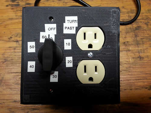 Para solucionar este problema, hice una toma de corriente duplex cronometrado. Tape la salida temporizada en un tomacorriente de 120v. Luego, enchufe el cargador en el tomacorriente duplex conectado al temporizador. Finalmente, ajuste el temporizador a 20 minutos y a pie.
