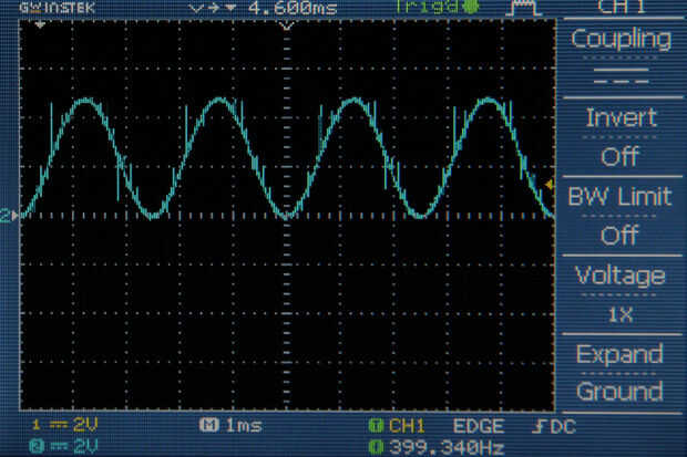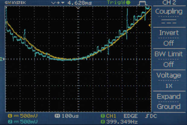 Aquí está el código del paso anterior, editado para que no utiliza las patas PWM. Como veis en la figura 1, la salida no filtrada de la DAC tiene muchas discontinuidades causadas por la diferencia entre enviar datos al puerto d y Puerto b como división los comandos de ajuste de pernos de alta y baja. Usted puede deshacerse de la mayoría de estas discontinuidades con el filtro de paso bajo (Fig. 2). Si desea utilizar esta técnica podría considerar aumentar la frecuencia de corte del filtro paso bajo. Si desea hacer esto muy bien, podría enviar sus 5 bits más significativos al puerto d y sus 3 bits menos significativos al puerto b. Esto podría disminuir la amplitud de algunas de las discontinuidades, reduciendo la magnitud del ruido. Voy a dejar adivinar que uno por su cuenta.