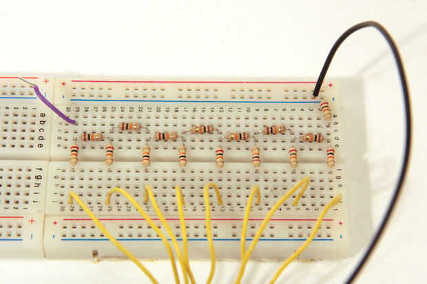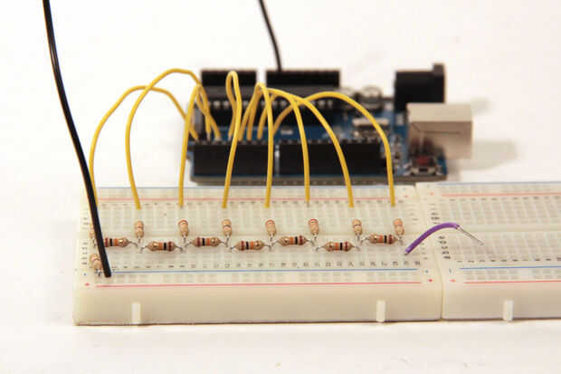 fijó clavijas 0-7 alto. Esto hará que la DAC a la salida de 5V. También podemos enviar combinaciones de baja y alta los Estados a la salida un voltaje entre 0 y 5V de la DAC. Por ejemplo: