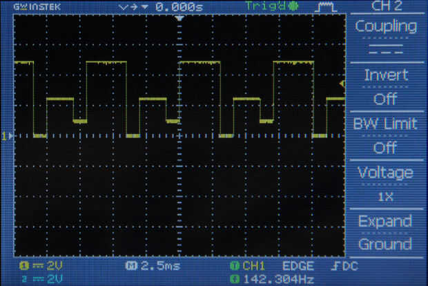 La salida se muestra en un osciloscopio en la figura 4. La línea horizontal en el osciloscopio representa 0V y cada línea horizontal representa una aumento/disminución de voltaje de 2V. Las notas de la imagen en la figura 4 muestran la salida de cada una de las líneas de código anterior, haga clic en la imagen para ver las notas de la imagen.