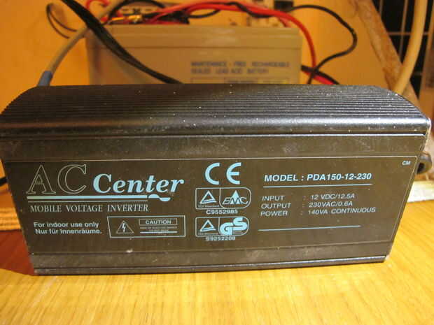 Ya tuve un inversor que utiliza en el coche para cargar la laptop u otras cosas. Este inversor tiene un enchufe de encendedor 12 voltios para la entrada y una salida de 230 voltios en una toma de corriente estándar. Para ser mas flexible compré un enchufe impermeable incorporando un interruptor.