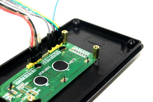 Utilizando una dremel, cortar un rectángulo grande hacia fuera en la tapa de la caja del proyecto. Asegúrese de que el rectángulo sea lo suficientemente grande como para caber la pantalla LCD, pero no tan grande que se puede ver el PCB. Cuando esté seguro de que los cortes son precisos, cuatro agujeros para atornillar montar la pantalla. Tornillo en la pantalla y terminar el trabajo girando las cuatro tuercas en los tornillos.