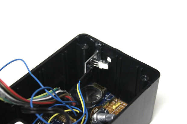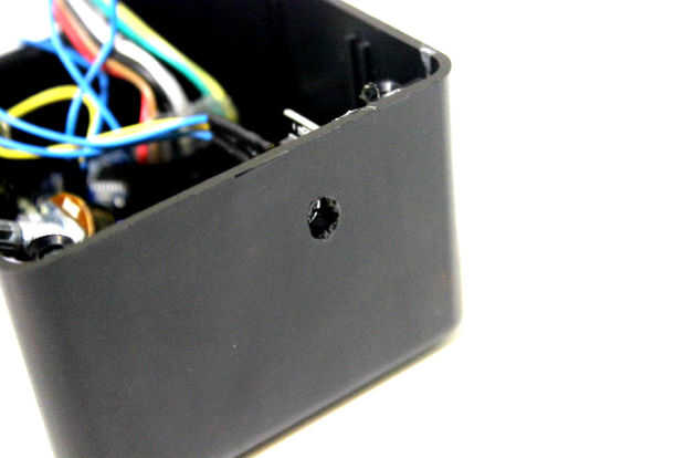 Comenzar por dremeling un agujero del tamaño del receptor IR, para que se pueda introducir a través del agujero en el recinto. Luego pegamento caliente el receptor en el interior de la caja de proyecto hacia el agujero de dremeled. Finalmente presione el receptor para que sobresalga por el agujero.