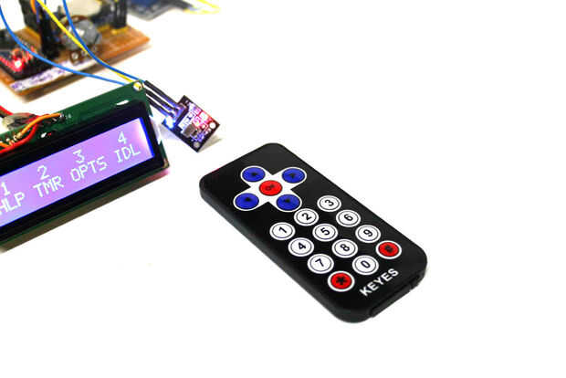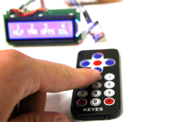 Ahora que todo el código está cargado correctamente, asegurémonos de que todo funciona de la manera que debería. Conectar tu arduino a través de USB (o FTDI) a un ordenador para poder. Usando a su Keyes remoto, intente navegar por los distintos menús que se muestran en la pantalla. Si tienes problemas con el ri remoto, asegúrese de que usted utiliza los pines correctos, como se dijo antes y asegúrese de que el receptor de infrarrojos no está conectado al pin 13 (ya que podría producirse un mal funcionamiento debido a un ser de LED en serie con el pin 13).