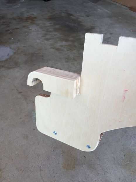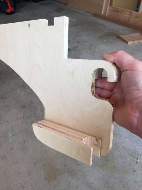 Una vez que el pegamento se haya secado puede ponerlo en su sierra y cortar la forma del gancho (o jigsaw). Es la barra que está colgando en exactamente 1" de ancho, así que cortar cuidadosamente y asegurar se sienta cómodamente y firmemente en la barra sentado al ras hacia abajo en la parte superior del gancho.