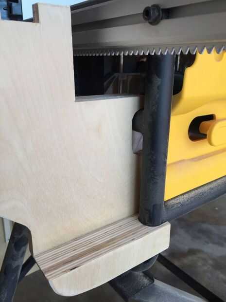 Tome nota: la altura desde el interior parte superior del gancho para que la mesa se sentará en el borde superior debe estar 2 13/16". Ver el plan. Esto asegura que sentará la mesa exactamente 1/8" de baja de la Sierra de mesa superior. Necesitas la tabla de salida superior al ser ligeramente más bajo que la Sierra de mesa parte superior para que la madera se deslice en la tabla VI y cae ligeramente sobre la mesa de su salida.