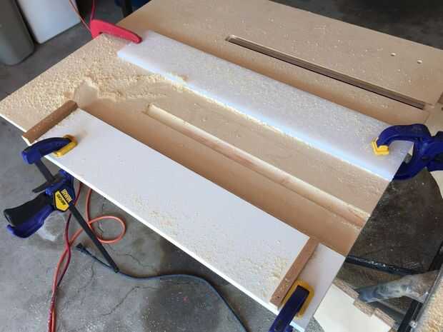 Como se puede ver enruta dos largos surcos en la parte superior de la tabla así que mi trineo Cruz corte puede resbalar fuera de las pistas de inglete y en mi mesa de salida sin ser obstruido.
