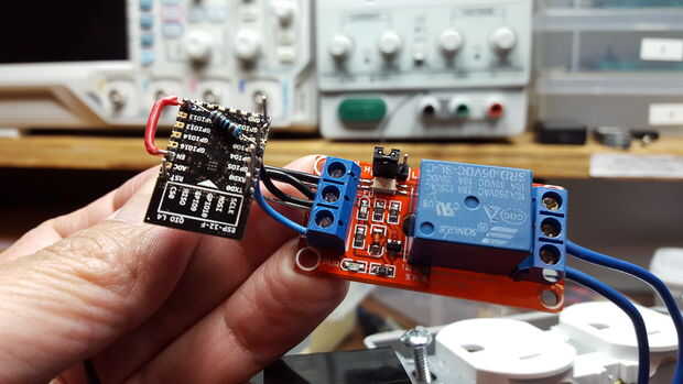 Como se puede ver en las fotos, en el lugar de montaje el módulo de relés en un PCB, usar el módulo de relés como el pedazo de centro. Montara el AMS1117 LDO (Low Drop Out regulador de voltaje) y el ESP8266 en el módulo de relés. Los cables son suficientemente rígidos para sostener el ESP en lugar. Descubrí que los 3,3 v salida del LDO está disponible en el pin central y en el disipador de calor que es más conveniente para estructuralmente sostener el ESP en su lugar.