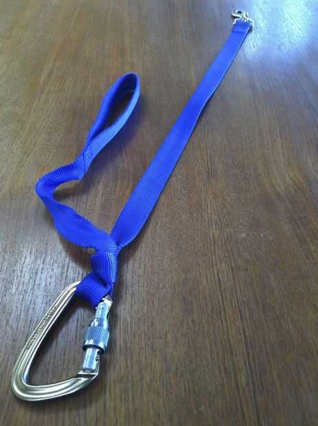 Al atar el nudo para el primer inicio de tiempo atando la correa a su perro. Con perro en el lado izquierdo puso el mosquetón de la correa y mantenerla hasta su cadera izquierda con la mano izquierda. Utilice su mano derecha para tirar la parte floja de la correa por el mosquetón hasta llegar a una distancia cómoda para usted y su perro. Ahora haga el nudo alrededor de la parte estrecha del mosquetón donde su mano izquierda sostiene la correa.