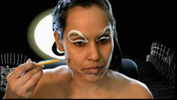 Trazado de Sally ojos y cara con pintura de cara y cuerpo de Wolfe en blanco.