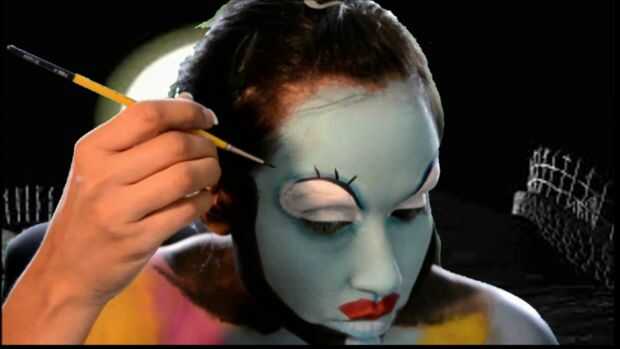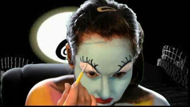 Sally!Paso 1: primer paso mapa hacia fuera su idea y luego rellenar su cara con un color verde azulado, dejando los ojos en blanco.Paso 2: ojos el exterior de los ojos con una sombra de ojos azul de la cortina, poner azul oscuro sobre el ojo, delinea