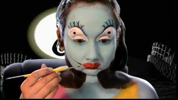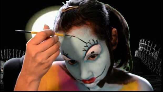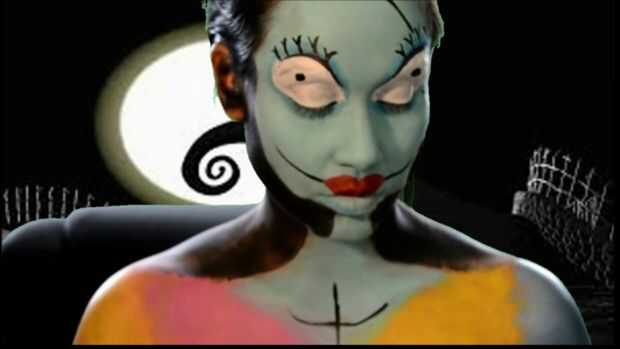 Sally!Paso 1: primer paso mapa hacia fuera su idea y luego rellenar su cara con un color verde azulado, dejando los ojos en blanco.Paso 2: ojos el exterior de los ojos con una sombra de ojos azul de la cortina, poner azul oscuro sobre el ojo, delinea
