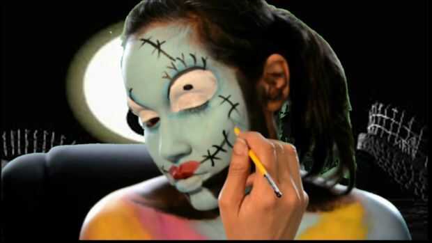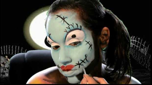 Sally de pesadilla antes de transformación de maquillaje de Navidad