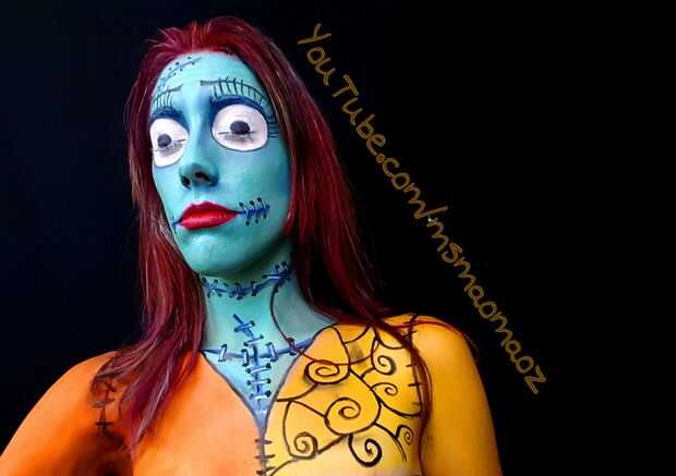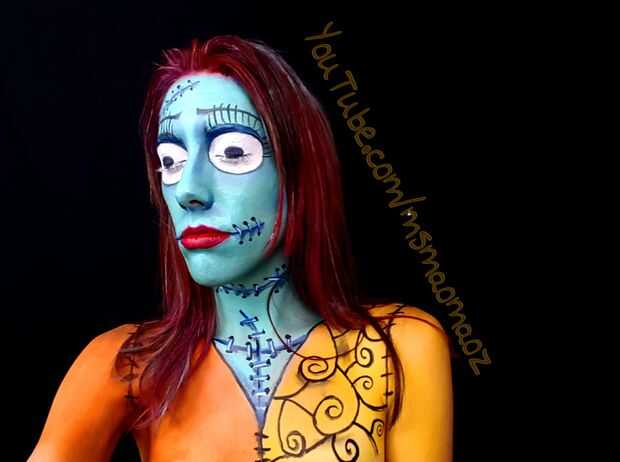 Sally de pesadilla antes de transformación de maquillaje de Navidad
