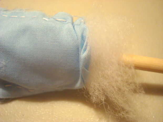 Rellenar el cuerpo de la muñeca y coser el extremo abierto para asegurar el relleno. encontré que era más fácil hacer los brazos y las piernas a la derecha lateral utilizando el pincho y sólo gire alrededor de dos pulgadas y cosas un poco relleno en y usan el pincho para embalar y cosas un poco más y y continuar así hasta que los brazos y las piernas están casi llenos y entonces deben ser lado derecho hacia fuera.