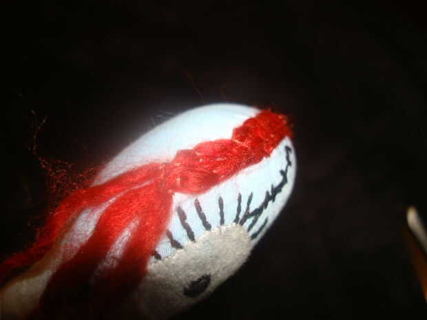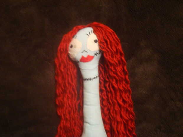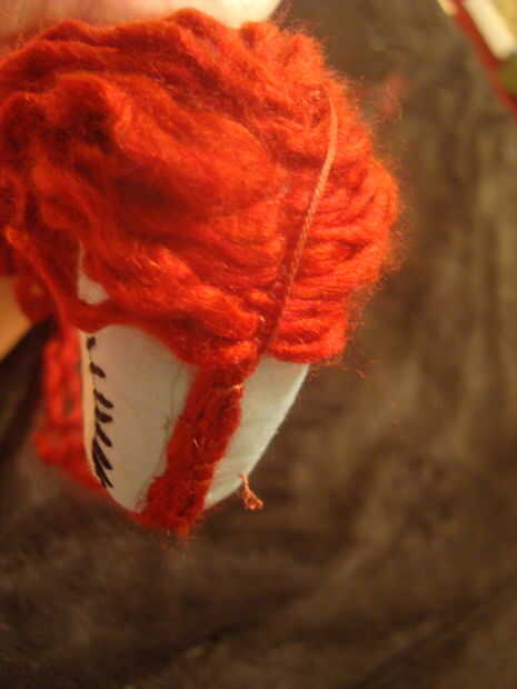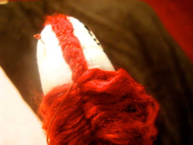 Coloque el centro del hilo sobre la cabeza de la muñeca donde desee coser y colocar un hilo al frente de la cara y la otra mitad sobre la parte posterior de la cabeza y puntadas para garantizar.