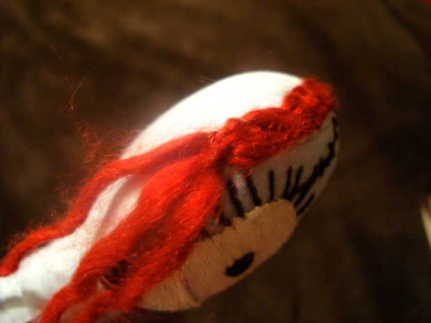 Cosa unas hebras de hilo para enmarcar las muñecas frente y parte de la cara como se muestra.