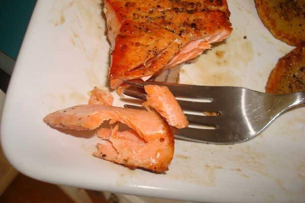 la receta (aquí, adaptado de un anuncio vino) llamado para cortar el salmón en tiras antes de asarla, pero encuentro que cocina intacto resulta en una mejor preparación y presentación. También, varios pinchos (metal o madera) facilita a los peces.Par