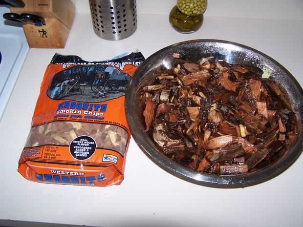 Este es el momento de preparación de la madera. Muchas formas de hacerlo, he decidido usar fichas en un molde de pan. De experiencias, y viendo a mi padre, empapando sus fichas permite un humo más, en lugar de virutas secas.