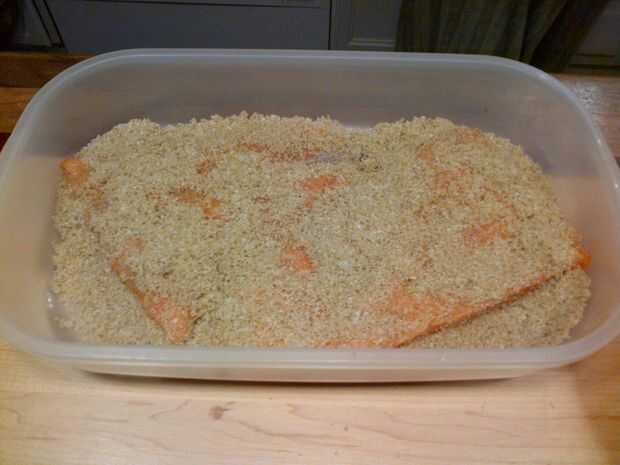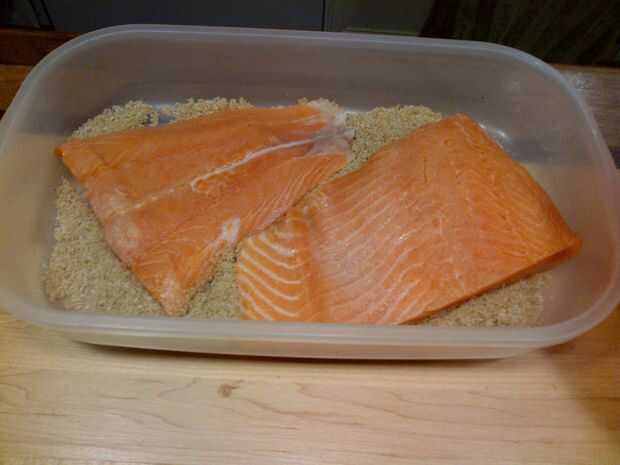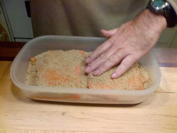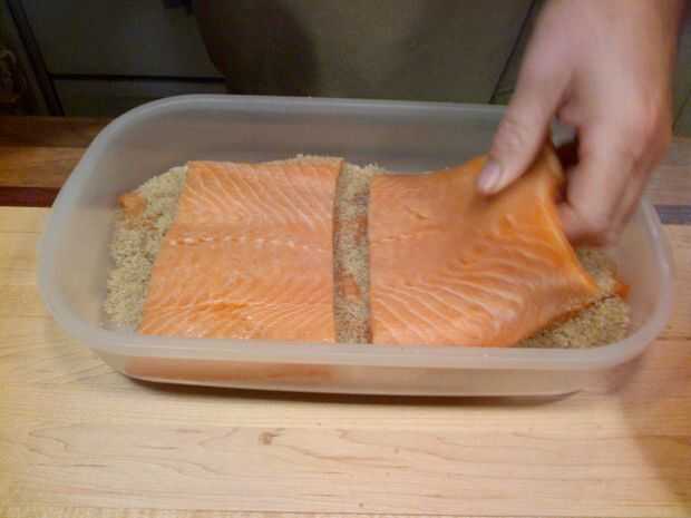 Cuando el salmón está completamente recubierto en mezcla de salmuera, cubrir la bandeja y colocar en la nevera durante 8 horas. La mezcla de salmuera seca lentamente extrae humedad del salmón.