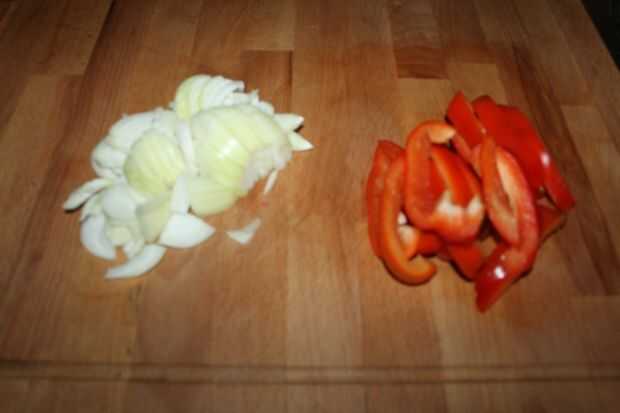 Picar la cebolla y el capsicumand rojo Coloque un lado.