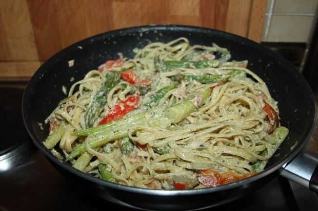 Salmón ahumado y Fettuccine en crema de pimiento rojo (6 / 7 paso)