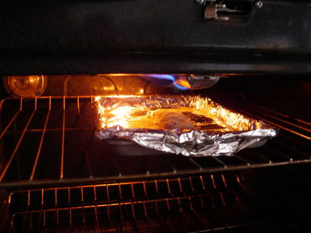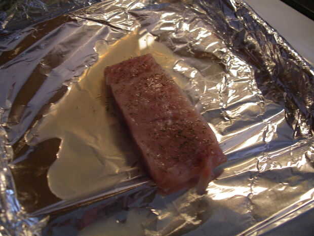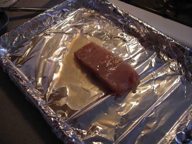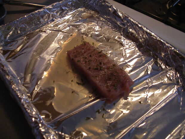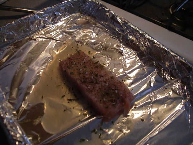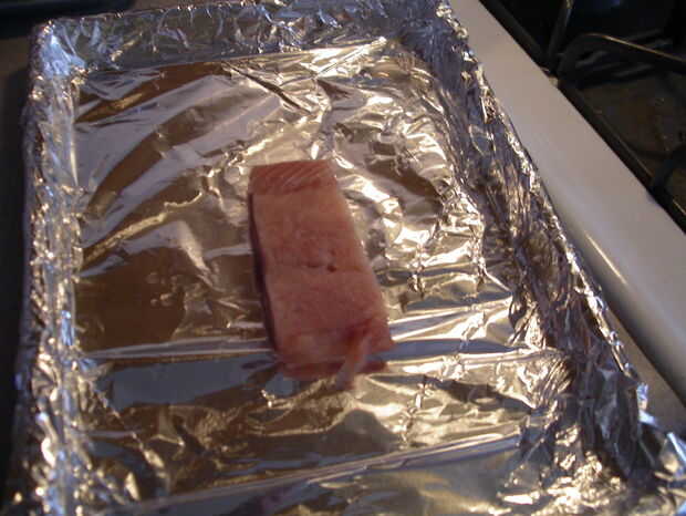 Cubrir la bandeja para hornear con papel de aluminio, luego coloque el salmón en el centro.