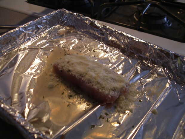 Finalmente cubra el salmón entero con queso parmesano. Yo finamente rallado lo que viene en una lata, pero la reja su propio de un bloque no iría mal.