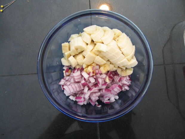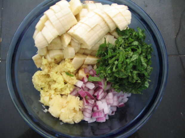 varios plátanos, cortados en pedazos grandes. Ligeramente verde es bueno.