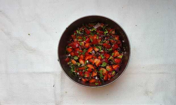 La receta original era de http://heatherchristo.com/cooks/2014/06/24/crispy-salmon-with-strawberry-basil-salsa/La canción usada en el video se llama "apenas como eso" por Tony Purrone. La música está disponible para su compra en http://www.cdbab