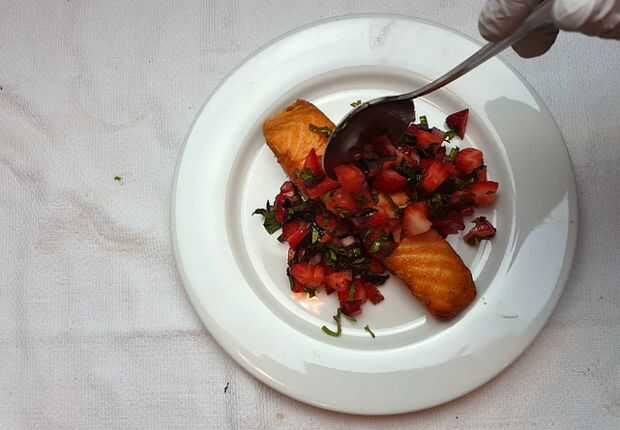 La receta original era de http://heatherchristo.com/cooks/2014/06/24/crispy-salmon-with-strawberry-basil-salsa/La canción usada en el video se llama "apenas como eso" por Tony Purrone. La música está disponible para su compra en http://www.cdbab